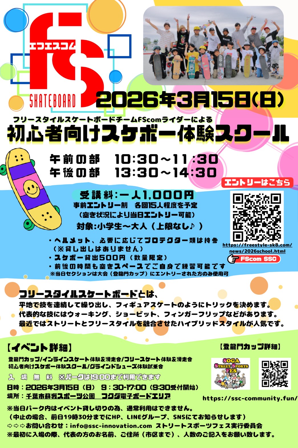 スケボー練習会 月一で開催しています! 更新日:2025年5月21日 公開日:2024年9月30日 ニュース 千葉県市原市の上総更級公園、軽スポーツ広場で大体月一回、だれでも参加可能な練習会をやっています! 開催日の情報などInstagram @fscomsb にて情報配信中 https://www.instagr […] 続きを読む